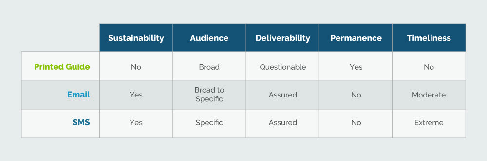 A high-level look at these marketing communication trends - from big audiences (printed guide) to specific groups (email) to personalized messages (texting) shows them going from one-to-many, to one-to-specific groups, to one-to-one. Like the national stage, each has its place and we don’t see any one of them going away. However, ensuring that you are using the right channel for the right message for each audience is critical. It could even become a point for equal and fair access to programs – if parts of the community aren’t reached they could be left out of valuable programs. Consider some of the pros and cons of each.